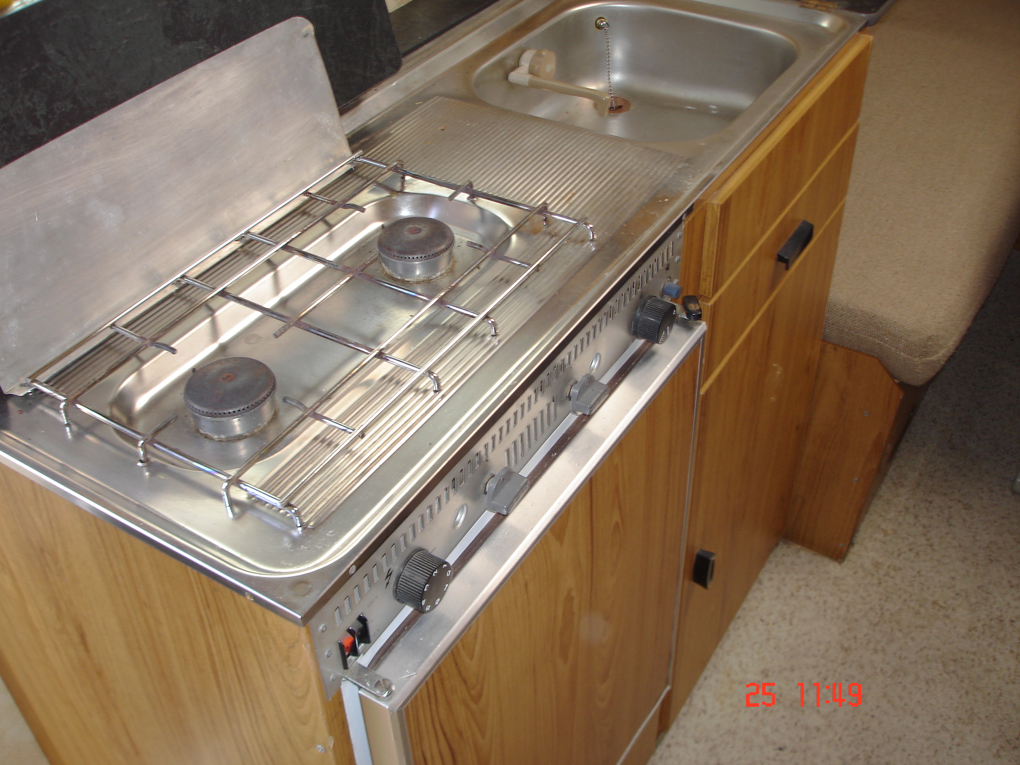 Der Gas-Ofen mit Kühlschrank und Spüle